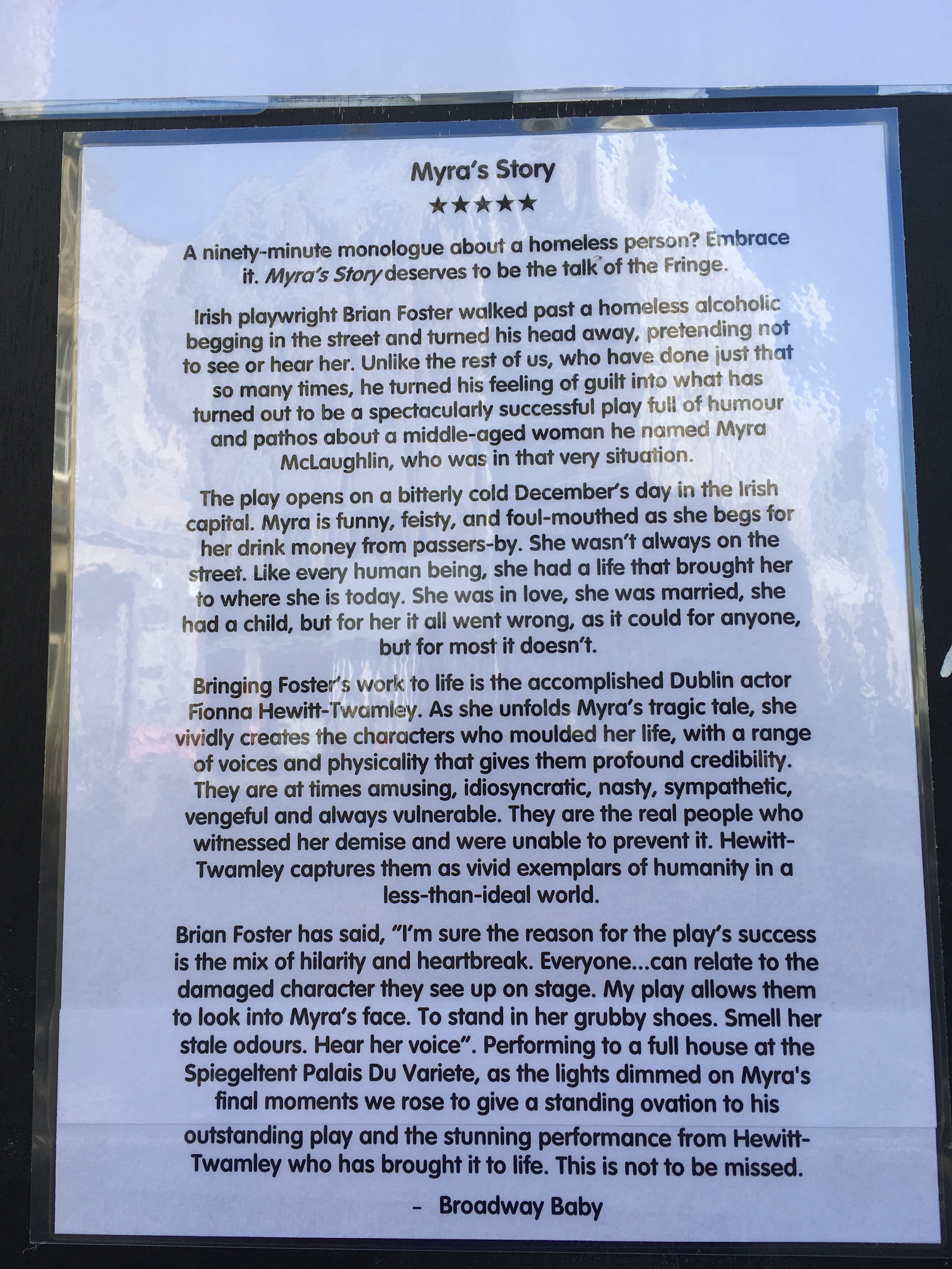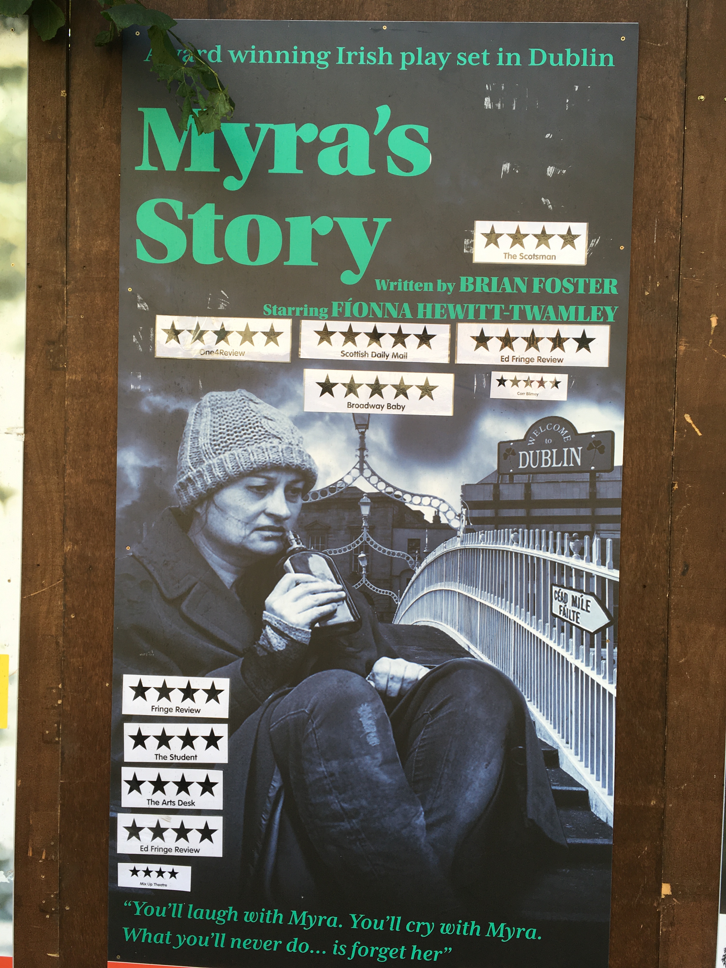 I was able to catch the tail end of a few shows. I’ll mention Myra’s Story – an emotional rollercoaster of a play, delivered by a solo actress, which bought tears to the eyes, standing ovations, and the prestigious Bobby award.
